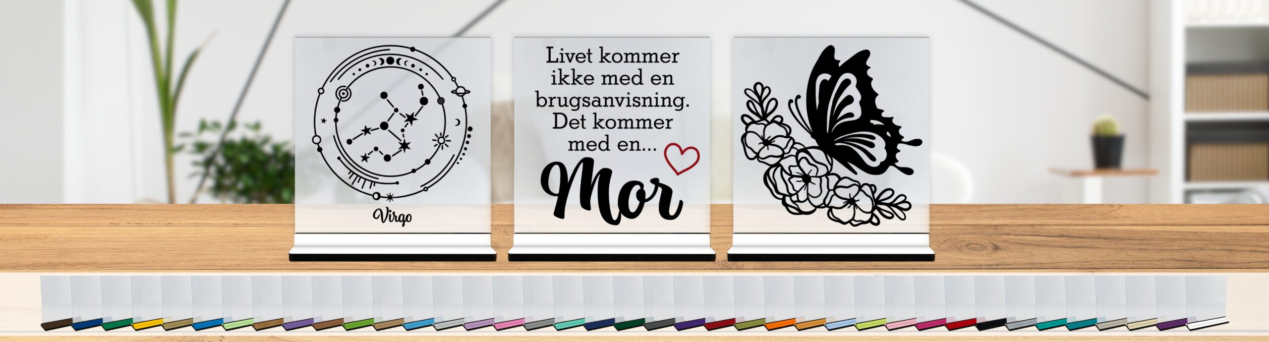 Vores glasskilte med farvet holder er ideelle som gaveide til enhver anledning. Vi har nemlig Danmarks største udvalg og du finder derfor kategorier til mor, far, bedsteforældre og oldeforældre, børn og børnebørn, søskende, faster, moster, onkel, morbror, venner, veninder m.m. Men du har også mulighed for at blive inspireret i vores store udvalg af hunderacer, katteracer, dyr, blomster, stjernetegn samt eventyr og fantasi m.m. Mange af vores glasskilte design kan personliggøres med navne, data, citater eller tekster m.m. På den måde opnår du en unik personlig gave som modtageren kan gemme og mindes i mange år frem. Glasskilte med farvet holder fra Hjemlux.dk er dansk design og dansk håndværk. Vores glasskiltemed farvet holder er perfekt både som gaveide til en der står dig nær, men også som boligindretning hvis du vil forkæle dig selv.