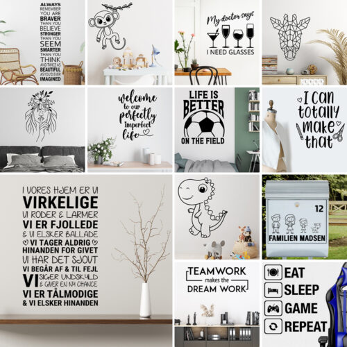 Vi har nemlig et stort udvalg til alle hjemmets rum. Så uanset om du søger vægpynt til badeværelset, stuen, børneværelset eller arbejdsrummet eller et helt andet rum, så kan vi hjælpe. Vores brede udvalg i wallstickers giver dig mange muligheder. Vi har et stort udvalg i tekst og citat stickers. Vi har til gamerrummet eller til væggene der skal dekoreres indenfor sport. Vi kan hjælpe med wallstickers som stjernetegn, motiver, dyr, opskrifter, temaer og meget mere.