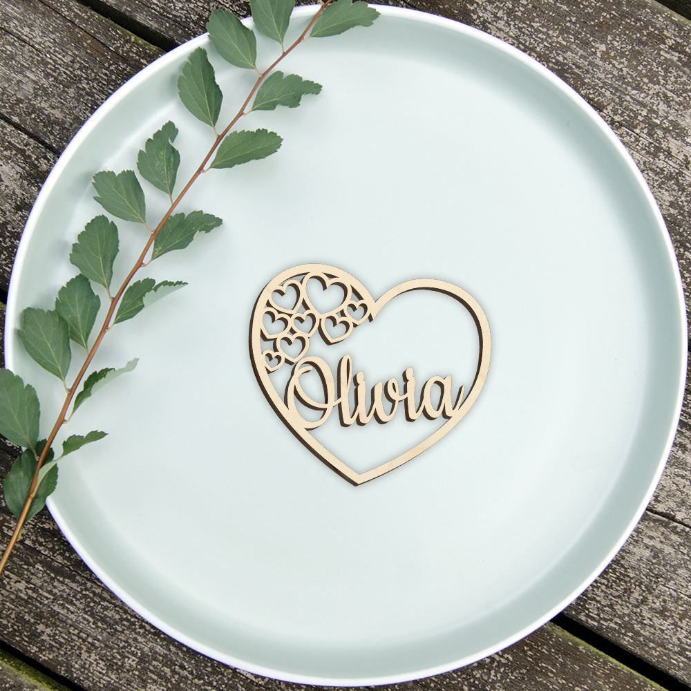 Personligt bordkort udskåret i poppel krydsfinér. De er perfekte til festlige begivenheder som barnedåb, konfirmation, bryllup m.m.