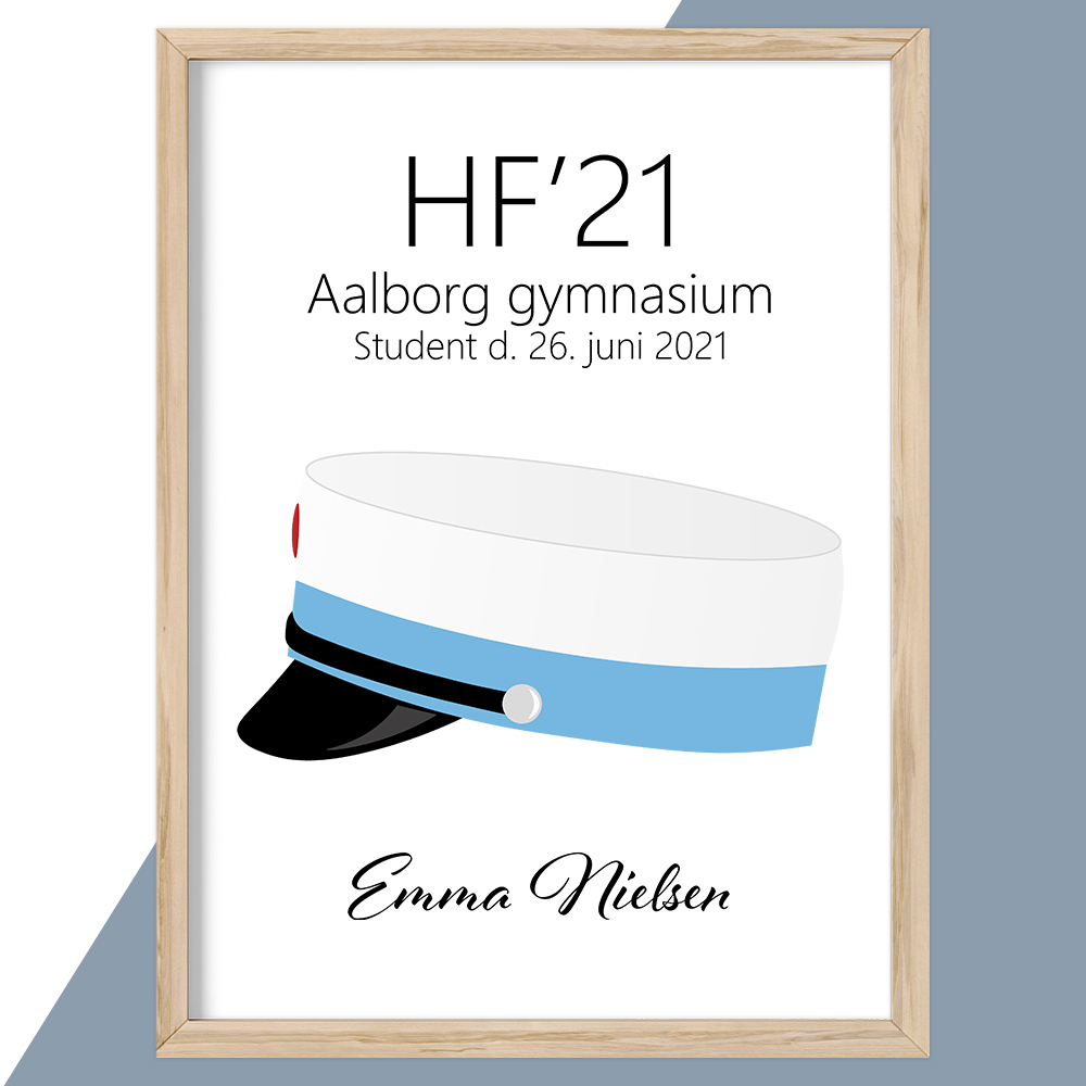 Plakat perfekt til HF studenten… med skolens navn, dato og eget navn, derudover har du også mulighed for at vælge farve på huens knap.