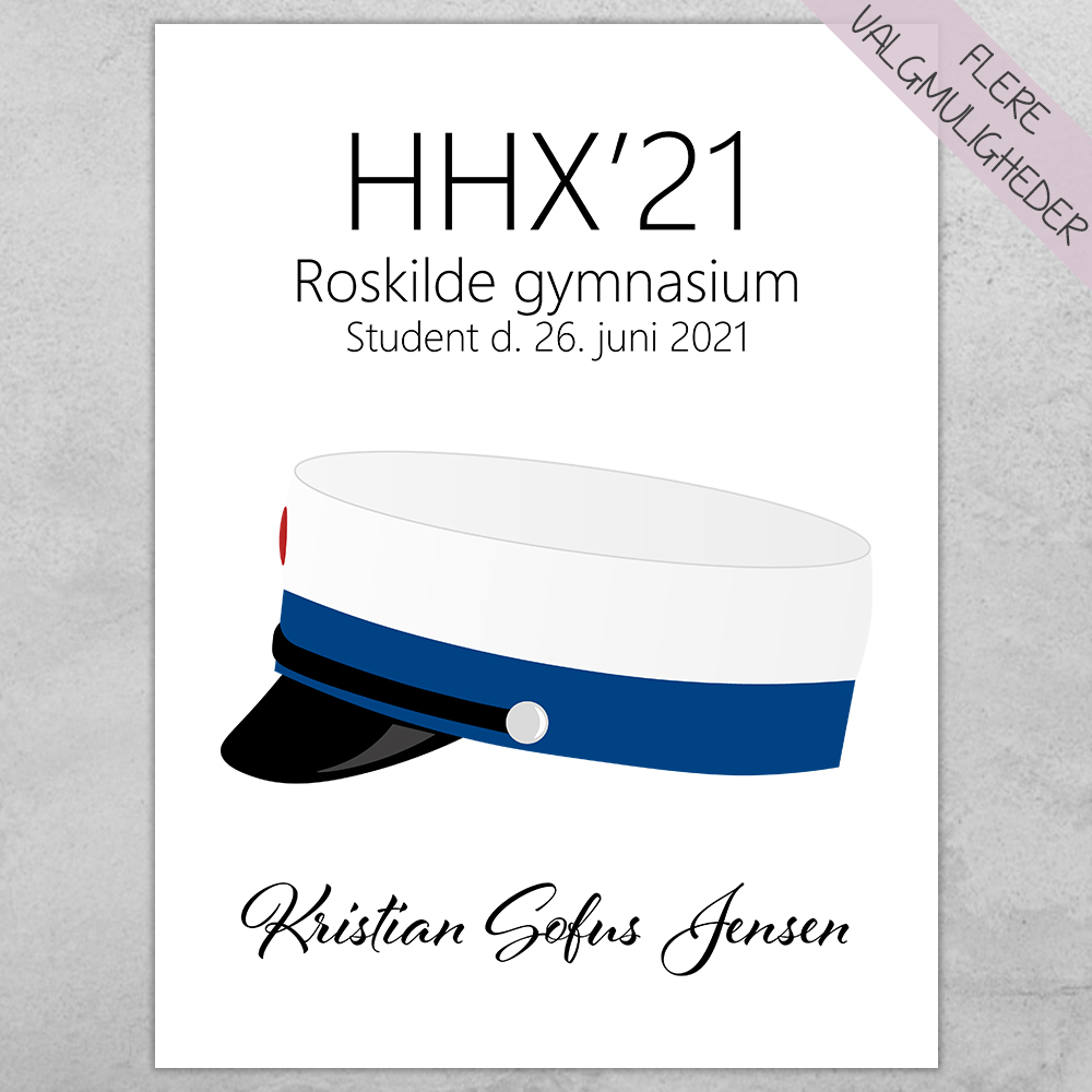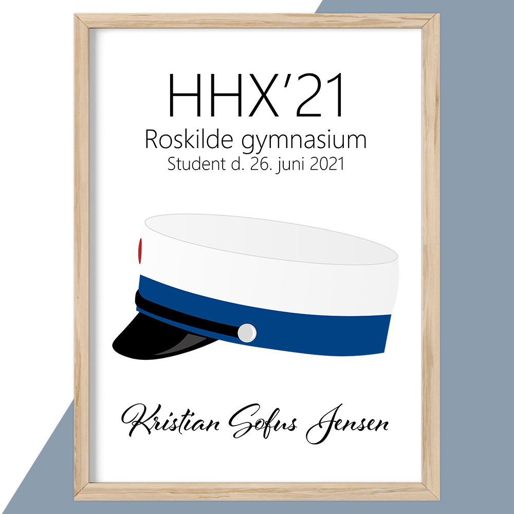 Plakat perfekt til HHX studenten… med skolens navn, dato og eget navn, derudover har du også mulighed for at vælge farve på huens knap.