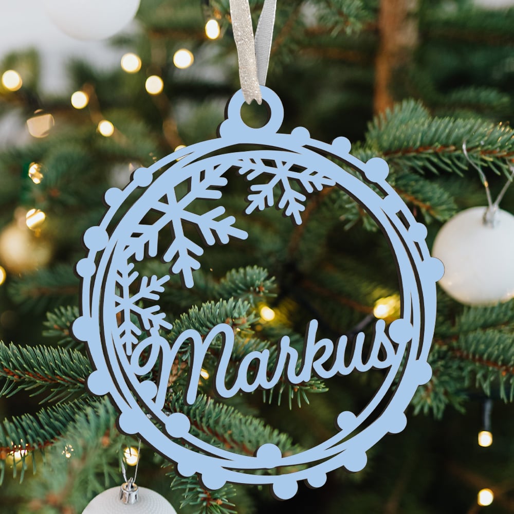 Personligt juleophæng udskåret i træfiber med farvet overflade, perfekt til at skabe stemning i juletiden.