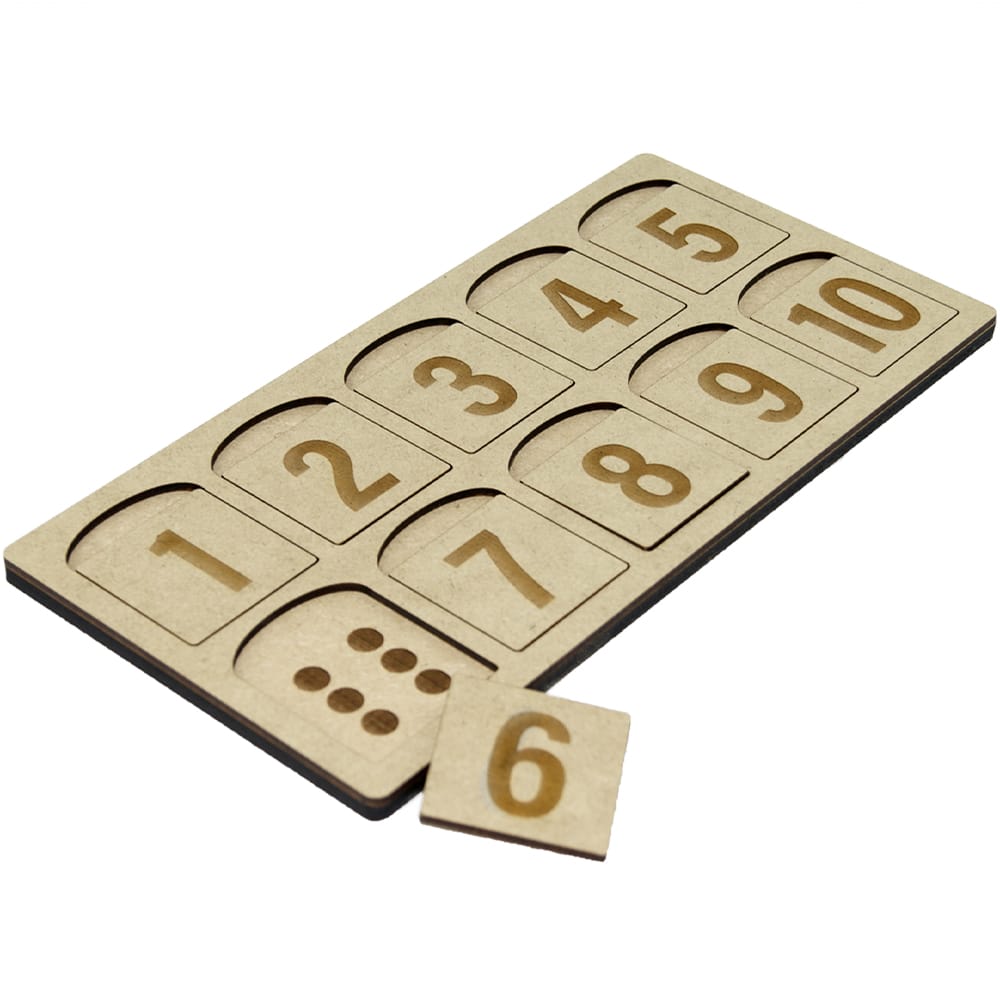 Matematik plade med ti brikker… brikkerne indeholder tal og skal lægges på det rum med samme antal prikker.