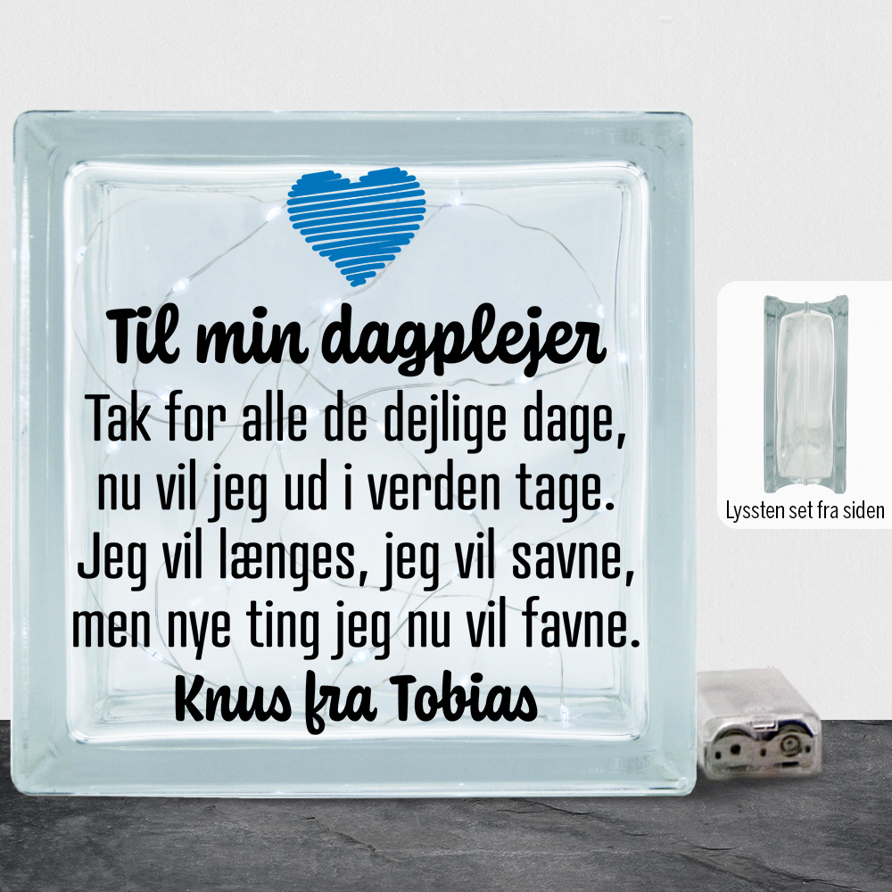 Udfyld den tekst du ønsker skrevet på nederste linje på lysstenen, husk at udfylde hele linjen præcis som du ønsker den, ønsker du f.eks. "knus", "fra" m.m. foran eventuelle navne.